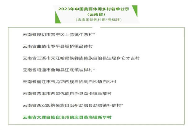 8月25日,農(nóng)業(yè)農(nóng)村部鄉(xiāng)村發(fā)展司發(fā)布了《2023年中國美麗休閑鄉(xiāng)村名單公示》,共有256個村落擬入選2023年中國美麗休閑鄉(xiāng)村名單。其中,云南省共有8個村落擬入選,大理州鶴慶縣草海鎮(zhèn)新華村位列其中。