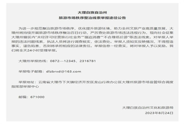 為進一步規(guī)范整治旅游市場秩序,優(yōu)化提升旅游環(huán)境,助力全州文旅產(chǎn)業(yè)高質量發(fā)展。8月24日,大理白族自治州文化和旅游局發(fā)布大理白族自治州旅游市場秩序整治線索舉報途徑公告。對舉報人舉報的違法問題線索,執(zhí)法人員將進行調(diào)查核實,依法查處。
