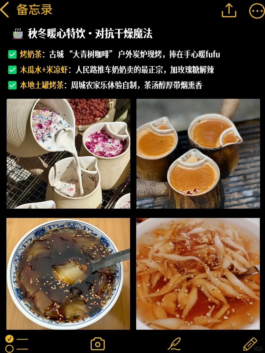 桂花釀:本地農(nóng)戶現(xiàn)釀的桂花酒,度數(shù)低微甜,配著烤乳扇吃,秋日氛圍感拉滿。記得買(mǎi)玻璃瓶裝的,方便帶走