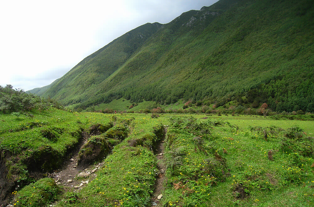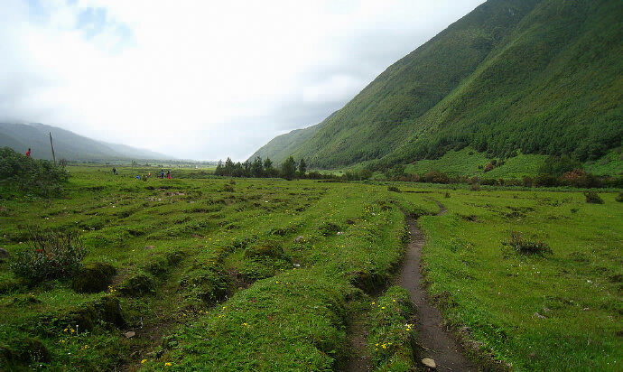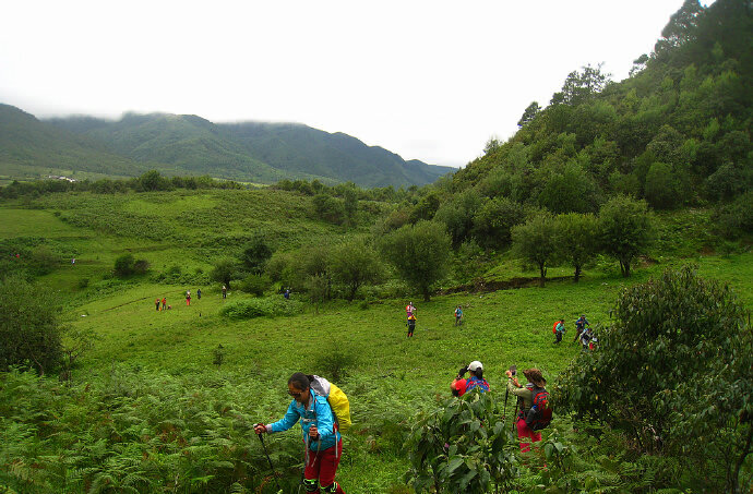 第一天20公里,喜洲文革村山口開始徒步,約1.5小時到達(dá)埡口,埡口邊有些工棚,有山泉水,可在此休息,埡口過有個岔路口,右邊是修好的土工路,請往左邊的山路走,約4小時可到達(dá)社會主義總路線路碑,之后3小時是平坦的大花甸地區(qū),順著已經(jīng)沖毀的公路痕跡一直往前走,7小時左右到花甸壩藥材場,記得是過一個小橋,有村莊感覺的地方,因?yàn)榉孔訉?shí)在太少,所以不要走過了.