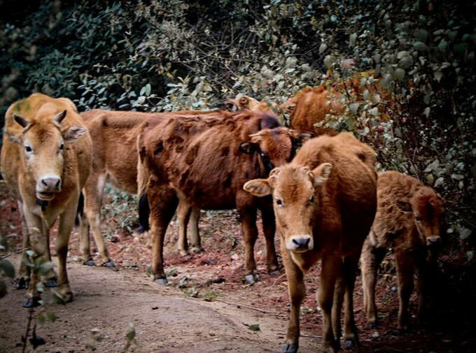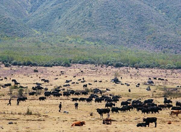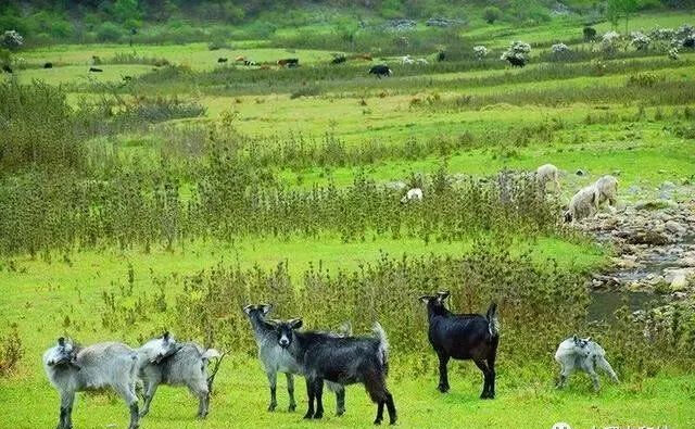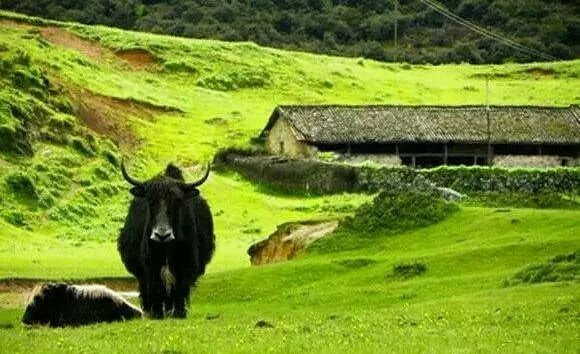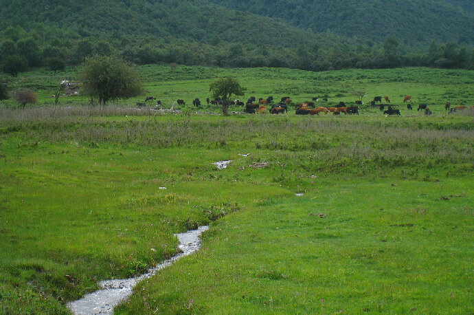 在這個高山草場里,成群結(jié)隊的黃牛、牦牛、綿羊和三三兩兩的馬兒,在悠哉的吃草、追逐、戀愛,或者躺著曬太陽,很是自在。