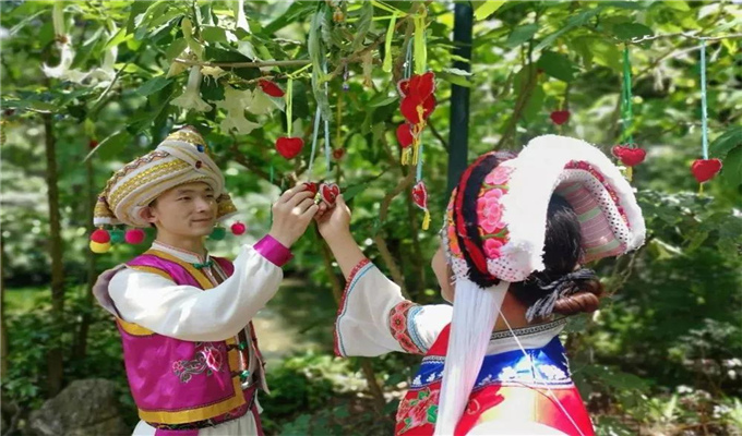而后,每年的這一天,山花爛漫時,無數(shù)美麗蝴蝶都會聚集泉邊,講述動人的愛情故事。霞郎和雯姑跳潭的日期是農(nóng)歷4月15日,也就是有名的“蝴蝶會”,白族青年的“情人節(jié)”。