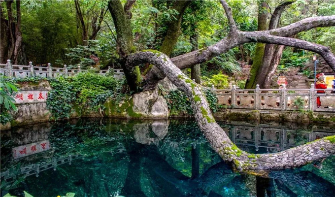 從泉底冒出,橫臥泉上的高大古樹便是合歡樹。合歡樹遒勁有力的樹干伏于泉水之上,似與泉水共纏綿。每年夏天,樹上淡黃色的花朵成片開放,遠遠望去,就像盤旋在枝頭的蝴蝶,蝶花相映,神秘動人。