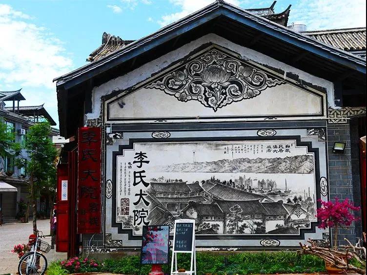 李氏大院是白族傳統(tǒng)民居“四合五天井”的典型建筑,有大門,后門,四方有四幢樓房合在一起,每兩幢房之間有一小天井,院心為大天井,共有五個(gè)天井,大門為三滴水造型,雕梁畫棟,飛檐翹角,彩畫以文房、詩書、花鳥、山水、蟲魚為主,充分體現(xiàn)房主人的意愿和家風(fēng)。