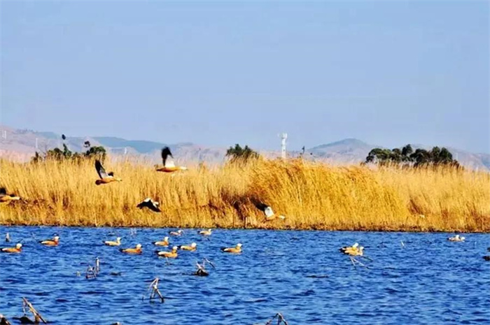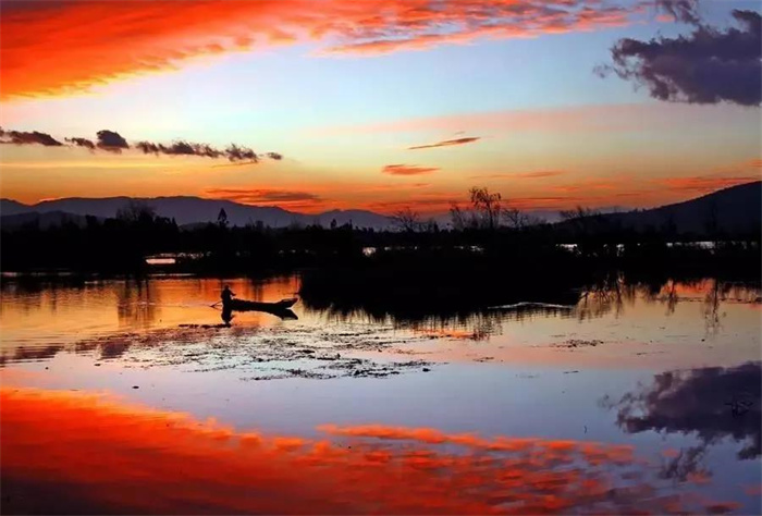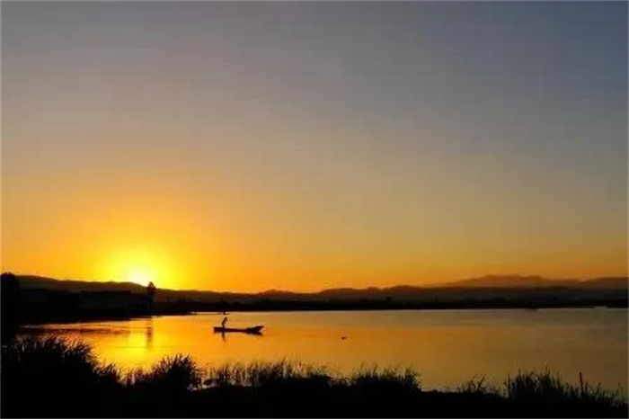 置身洱源西湖,仿佛置身一個神秘的天國。除了風聲、歌聲、鳥聲,整個西湖闃寂無聲。秋日的余暉輕輕拍打著它,它仰天向上,把神秘的幸福密碼深壓在身下?!昂馐幯鷰谆丶y,漁父歌聲鬧水濱,信口舢敲湘漢句,斷腸弄笛雁鴻云。三三對白煙蓑合,兩兩歸帆獲岸分。最趁夕陽含缺處,前村沽酒帶余醺?!痹谶@樣一幅背景中,偶爾還能看到牧童嬉鬧,大娘浣衣,村姑笑吟。