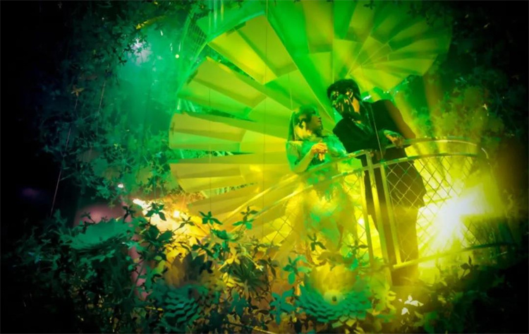 戲劇體驗(yàn)通道分為A線和B線。A線以完美女王和平凡男孩阿t的愛情故事為主線,唯美浪漫;B線解密圖靈教授的內(nèi)心和隱秘,充滿反轉(zhuǎn)和沖突。3500平方米的老廠房,以“變壓”為創(chuàng)意進(jìn)行改造,形成了具有沖擊力的情緒酒吧、欲望花園、秘密試驗(yàn)場(chǎng)與心音嗨場(chǎng)四大主題空間,整個(gè)變壓工廠都是《幻境2099》的舞臺(tái)。
